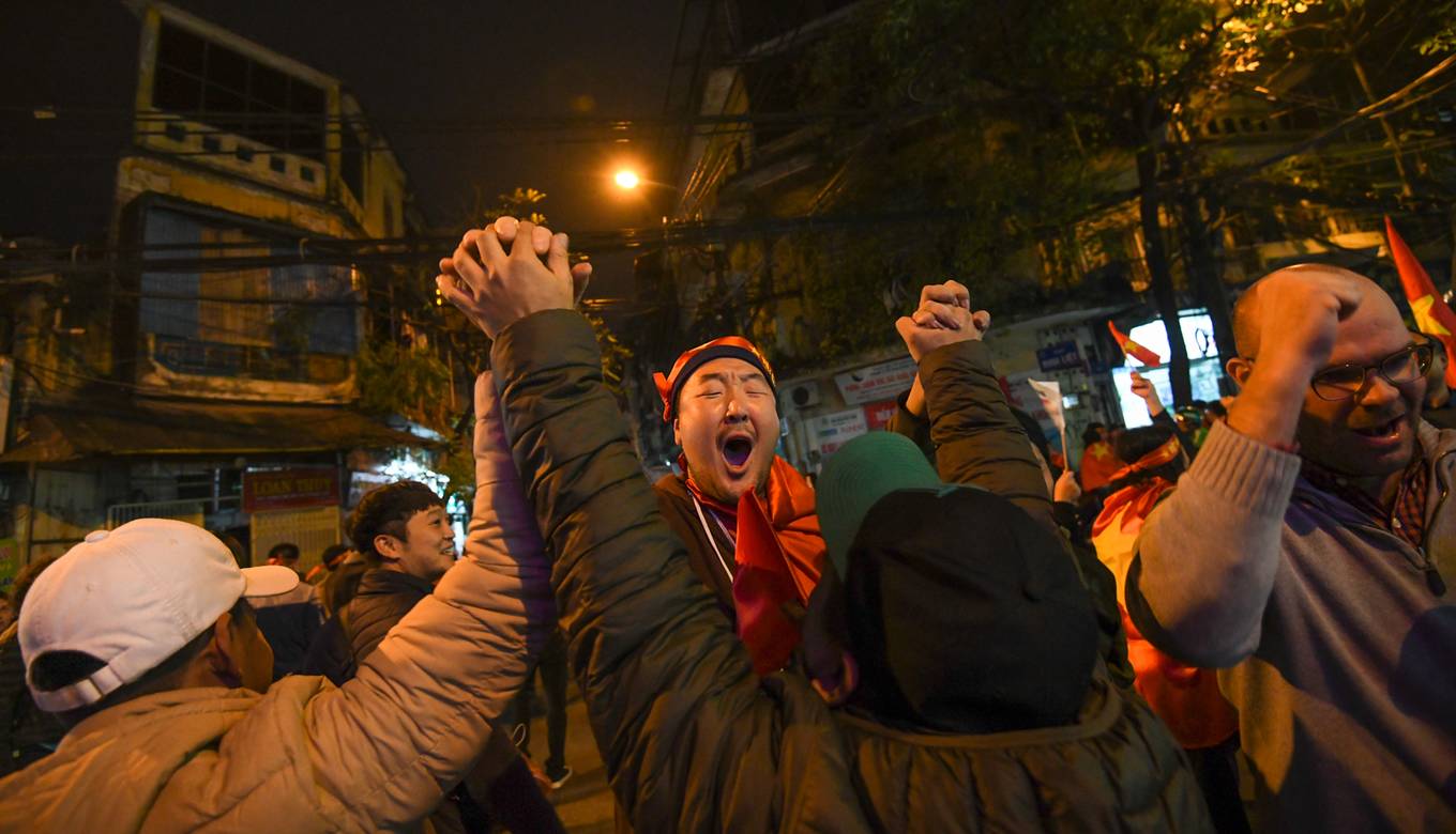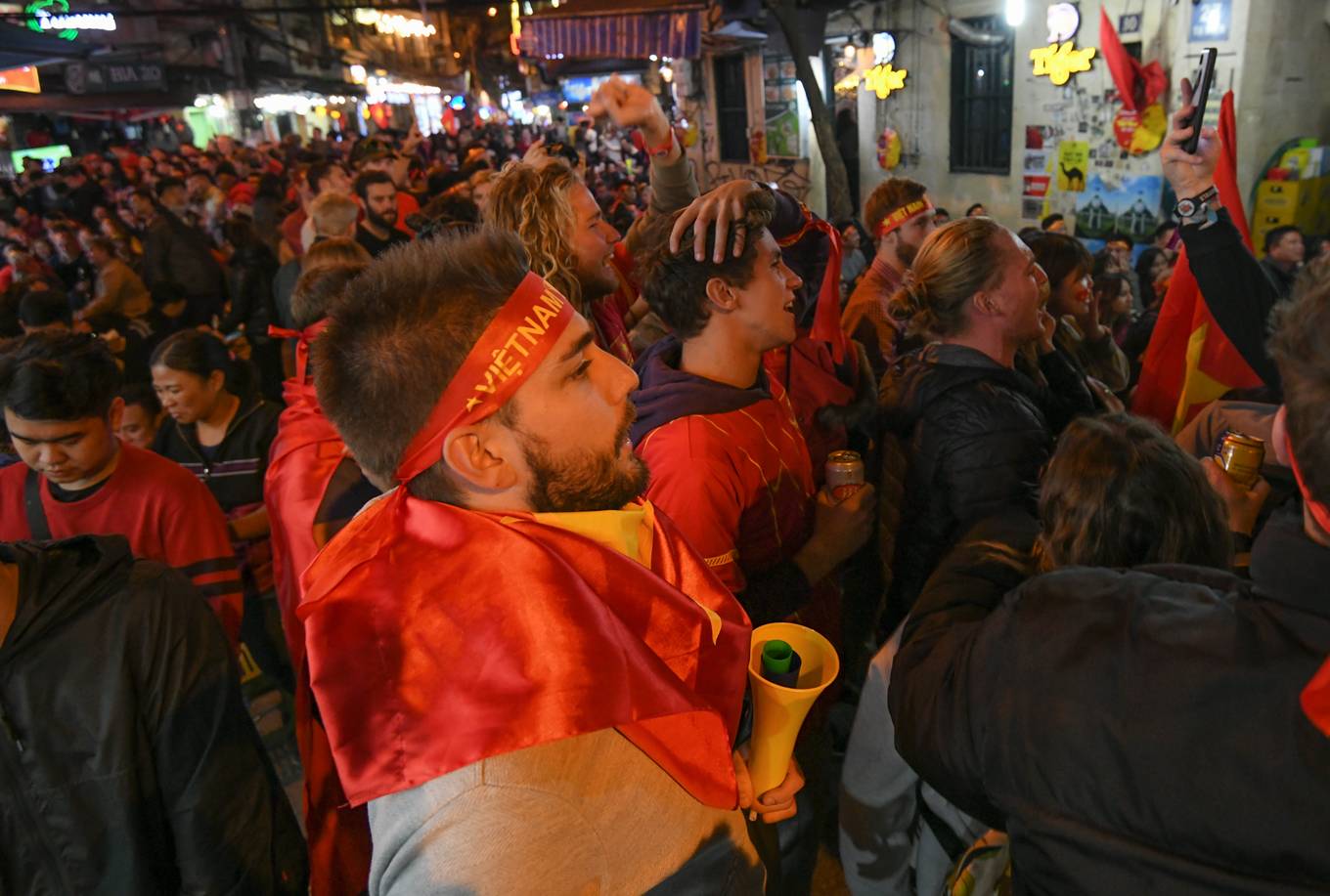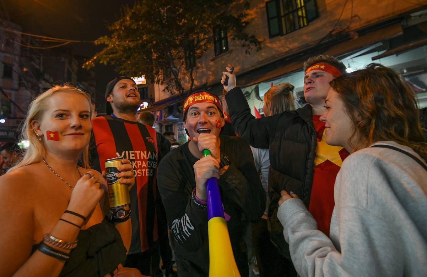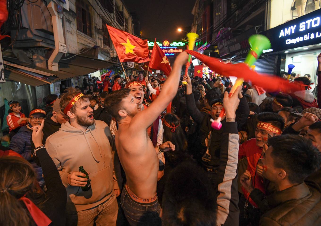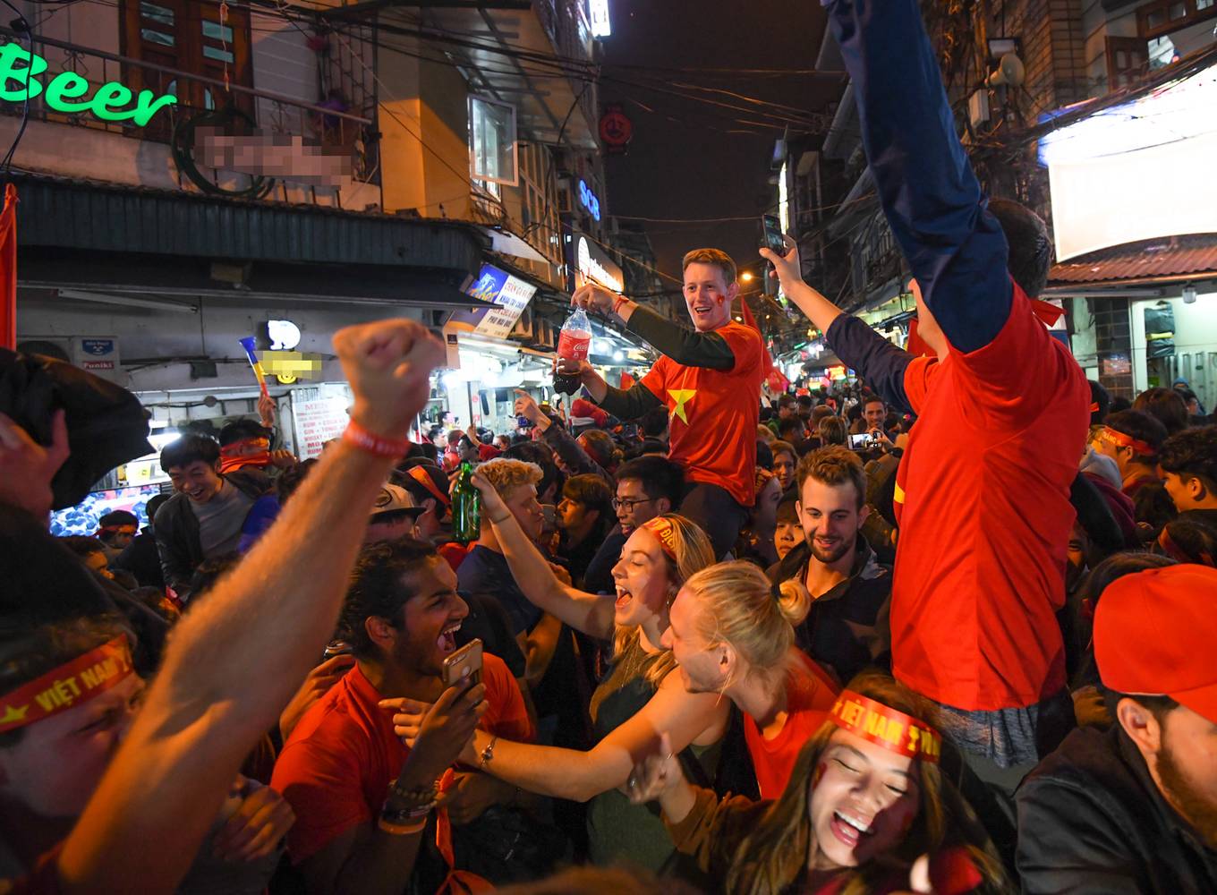 Phố Tạ Hiện (Hà Nội) ‘vỡ tung’ khi khách nước ngoài cổ vũ và mừng chiến thắng của đội tuyển Việt Nam.