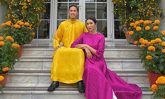 Theo thông lệ mọi năm, vợ chồng Tăng Thanh Hà – Louis Nguyễn luôn diện áo dài trong ngày mùng Một Tết. Ông xã diện áo dài gấm màu vàng rực lấy cảm hứng từ trang phục hoàng gia triều Nguyễn còn Tăng Thanh Hà chọn một thiết kế cách điệu màu hồng.
