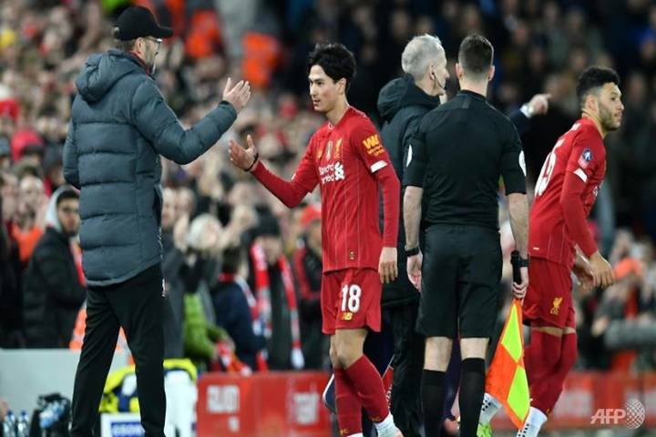 Klopp (trái) bắt tay với Minamino khi tiền vệ Nhật Bản rời sân. Ảnh: AFP.