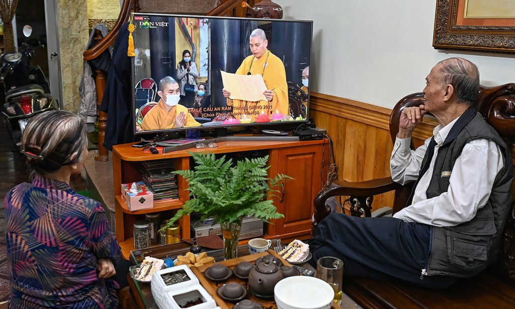Gia đình ông Hồng (quận Đống Đa, Hà Nội) sống cách chùa Phúc Khánh chưa đầy 500 m, vì dịch bệnh nên năm nay xem lễ cầu an qua tivi.