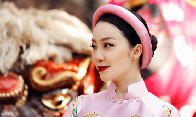 Nghệ sĩ múa Linh Nga diện áo dài họa tiết trâu vàng thuộc bộ sưu tập “Kim sắc niên hoa” của nhà thiết kế La Sen Vũ.