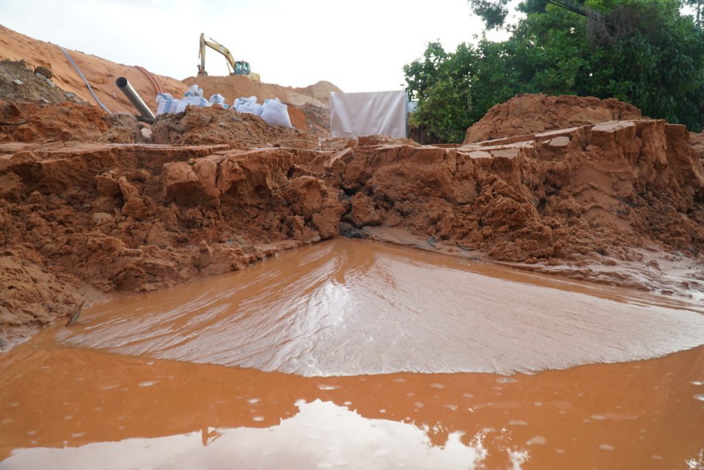 Trước đó, tháng 11/2019, mưa lớn cũng kéo cát đỏ của công trình xây trên đồi đổ xuống, tạo thành dòng lũ quét xé toạc mặt đường ven biển Phan Thiết – La Gi.