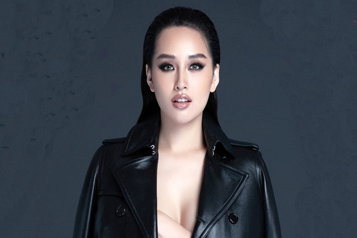 Hoa hậu Việt Nam 2006 dùng tay che ngực trần khi diện vest chất liệu da. Cô chuộng những trang phục gợi cảm.