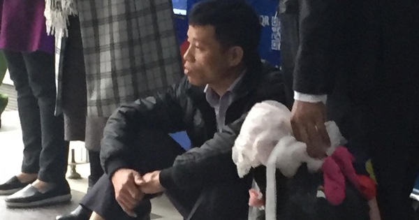 Bố cháu bé ngồi gục dưới sảnh của toà nhà, khuôn mặt thất thần, người thân phải dìu đi.