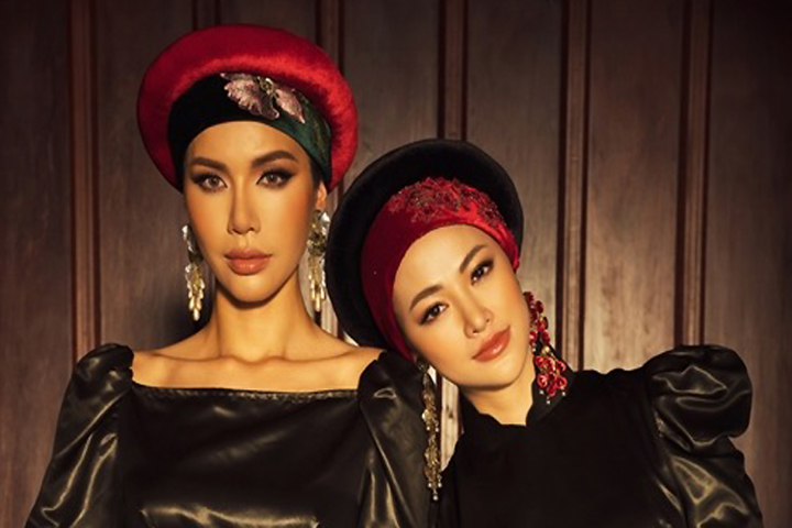 Hai người mẫu đội khăn vấn hình hoa.