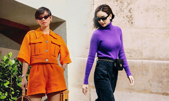 Những tông màu hot trend như cam, tím, đỏ được Hồ Ngọc Hà, Khánh Linh, Hà Thu phối đồ cuốn hút cho phong cách street style.Xu hướng color up được Hồ Ngọc Hà và nhiều sao Việt hưởng ứng để thể hiện độ sành điệu cùng trao lưu thịnh hành. Tông xanh lá khá nổi bật, vì thế các nàng có thể chọn trang phục đơn sắc hoặc áo họa tiết ton-sur-ton như Quỳnh Anh Shyn để mix đồ. Từ cuối mùa hè 2019, sắc cam đã được các fashionista thế giới lăng xê. Bước vào mùa thu đông, chúng tiếp tục nhận được sự yêu mến của Khánh Linh và các tín đồ thời trang Việt. Tông cam phối cùng gam đen là công thức mix màu khá ổn. Nếu thích khoe vẻ sexy thì các bạn gái có thể diện áo hở eo, quần chun gấu như Hà Thu.  Trà Ngọc Hằng với set đồ đúng điệu xu hướng thịnh hành gồm áo cổ lọ tông cam, chân váy da và các phụ kiện da đen bóng bẩy. Đứng sau tông cam là sự lên ngôi của gam tím mộng mơ. Cách đơn giản nhất để áp dụng sắc màu lãng mạn này là chọn các kiểu áo len, áo cổ lọ mix cùng jeans như Hà Thu. Thùy Anh thanh lịch cùng suit kết hợp áo lụa sexy. Giày hồng cánh sen là phụ kiện được nữ diễn viên chọn lựa để mang tới sự thống nhất cho tổng thể. Với sắc tím thiên về chất bánh bèo các nàng vẫn có thể phối đồ khỏe khoắn và trẻ trung như Tú Hảo. Sắc đỏ tươi nổi bật và mang không khí giáng sinh, Noel vẫn được phái đẹp thế giới ưa chuộng. Với gam màu này Sam chọn chân váy dập ly để mix cùng áo len họa tiết trái tim.  Chi Pu giúp mình trở nên cao ráo hơn khi diện mẫu quần ống đứng phối cùng áo len Chanel, bốt ánh kim. Ngoài sắc cam, tím, xanh thì tông vàng chanh kích thích thị giác cao cũng được nhiều sao Việt yêu thích. Kelly Nguyễn chọn túi Jacquemus tông trắng khi diện váy vải tweed hợp mùa.  Thúy Ngân khoe đường cong với váy ôm sát body. Phụ kiện belt da to bản tiệp màu bốt cổ thấp được nữ diễn viên chọn lựa để hoàn thiện set đồ.