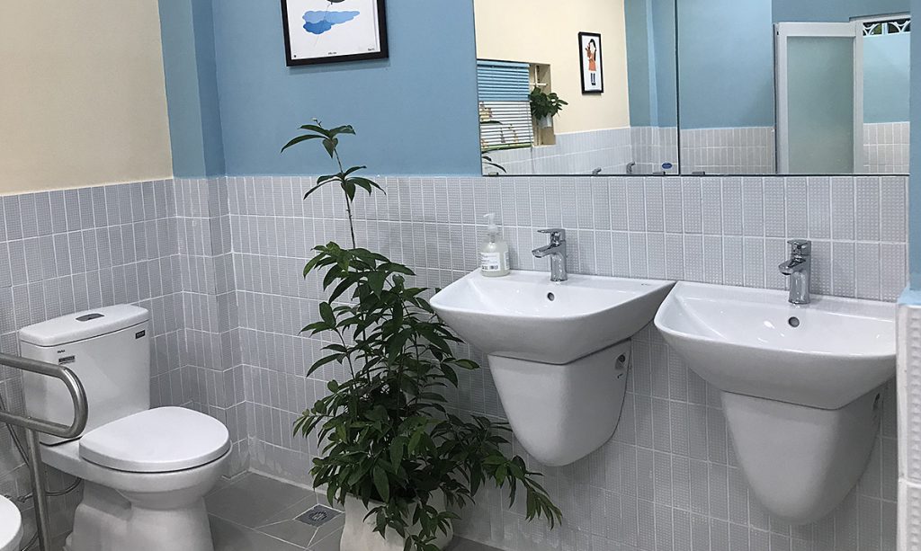 Sau khoảng 3 tuần thi công, hai nhà vệ sinh mới với hơn chục bồn cầu, cùng chậu rửa tay đã hoàn thành. Công trình được thông gió tốt, đón ánh sáng tự nhiên nhờ nhiều ô thông gió hướng ra vườn cây cùng giếng trời lợp tôn kính. Những hôm trời nắng, không cần bật điện, trong phòng vẫn sáng. Bên cạnh đó là hệ thống đèn âm trần, khi bật lên, ánh sáng chan hòa khắp phòng. Rồi chiếc gương lớn treo ở khu vực chậu rửa, những chậu cây xanh treo trên cao hay đặt dưới sàn, những bức tranh minh họa các bài học trong sách giáo khoa treo trên tường khiến Bằng và các bạn rất thích thú.