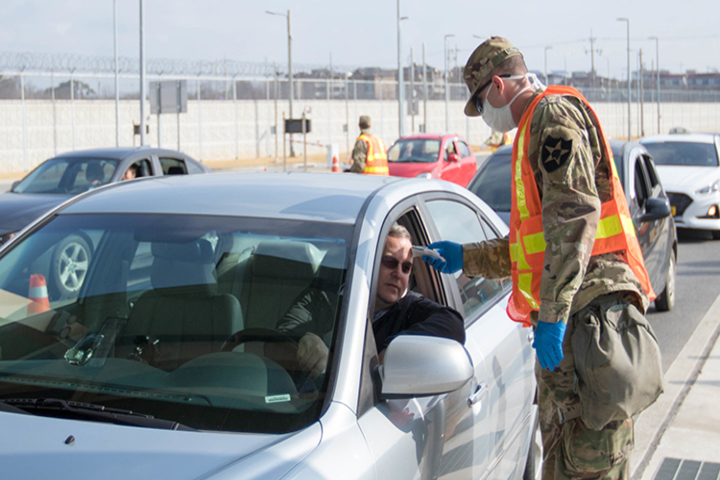 Binh sĩ Mỹ đo thân nhiệt người vào căn cứ Humphreys ở Hàn Quốc ngày 27/2. Ảnh: US Army.