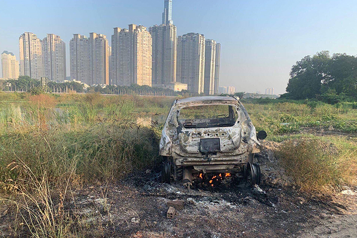 Chiếc ôtô của gia đình nạn nhân bị đốt cháy rụi. Ảnh: Quốc Thắng.
