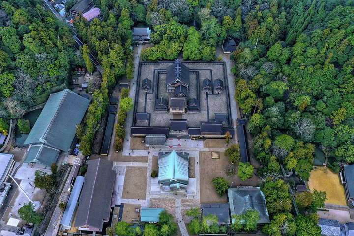 Toàn cảnh đền Izumo Taisha tựa lưng vào núi, quanh năm mây mù bao phủ.