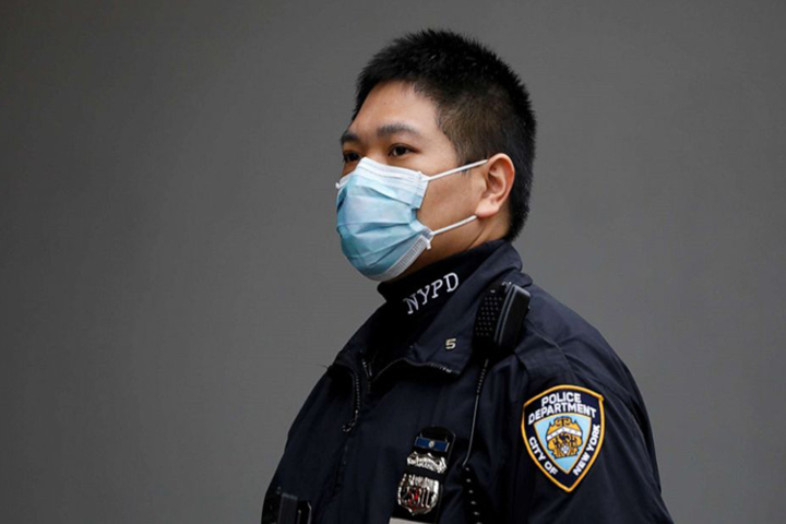 Một sĩ quan Sở cảnh sát thành phố New York (NYPD) đeo khẩu trang tại quận Manhattan, New York, Mỹ hôm 20/3. Ảnh: Reuters.