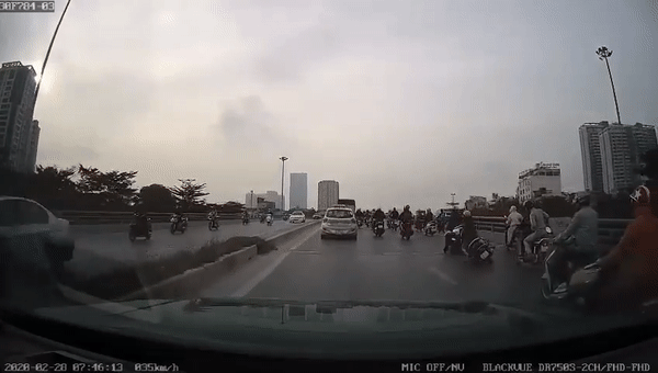 Một xe máy đi ở làn đường trong cùng phanh tránh một xe máy khác không thành. Va chạm khiến hai chiếc xe này móc vào nhau ngã ra đường kéo theo những người đi xe máy khác sõng xoài trước đầu chiếc XC60, lúc 7h45 ngày 28/2 đầu đường nối Võ Chí Công sang đường vành đai 2.