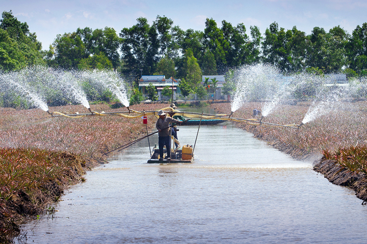Sáng sớm giữa tháng 2, ông Nguyễn Văn Chính (41 tuổi, ở Phú Sơn, Chợ Lách, Bến Tre) kéo dây dẫn được đấu nối với chiếc túi nhựa dài 10 m, rộng 2,5 m chứa đầy nước đặt ở góc vườn, mở vòi tưới vườn mai, sầu riêng giống gần 1.000 gốc. “Tôi mua chiếc túi này hai tháng trước, giá 2,4 triệu đồng, chứa được 15 khối nước, đủ dùng hơn nửa tháng cho vườn nhà”, ông Chính nói.