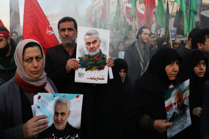 Người dân Iran cầm ảnh tướng Soleimani trong lễ tang ở Tehran hôm 6/1. Ảnh: AP.
