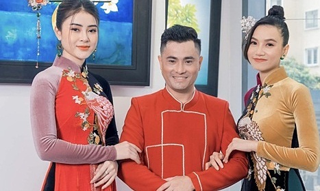 Không hẹn mà gặp, NTK Nhật Dũng, Lý Kim Thảo (trái) và Lương Giang (phải) cùng mặc áo dài. Cuộc hội ngộ giữa ba người con Bắc – Trung – Nam thêm phần thú vị giữa khung cảnh lãng mạn khi trời sắp sang xuân ở Hà Nội. Lương Giang quê Lào Cai, trưởng thành tại thủ đô. NTK Nhật Dũng gốc Quảng Bình còn Lý Kim Thảo sinh ra ở Bạc Liêu.