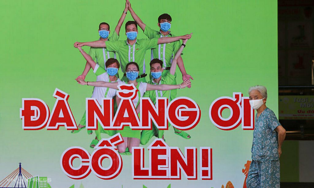 Một người dân đi ngang qua tấm pano trên đường Lê Duẩn (Đà Nẵng), chiều 7/8. Ảnh: Nguyễn Đông.