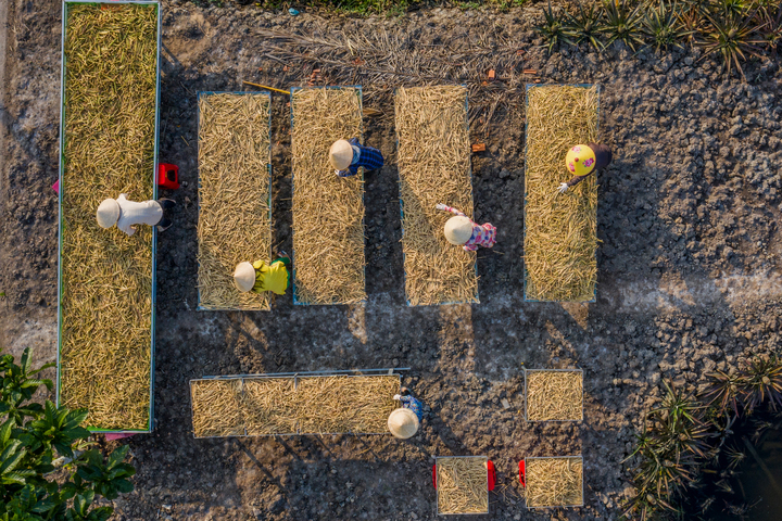 Những ống hút sậy sau đó tiếp tục được phơi khô ngoài trời trong vòng hai ngày, cho đến khi độ khô đạt khoảng 70%. Vào những ngày cận Tết, nông dân tất bật hoàn thiện những công đoạn cuối cùng cho ra lò sản phẩm để kịp giao cho khách. Những đơn đặt hàng trong tỉnh và một số đối tác nước ngoài đã được hoàn thành.