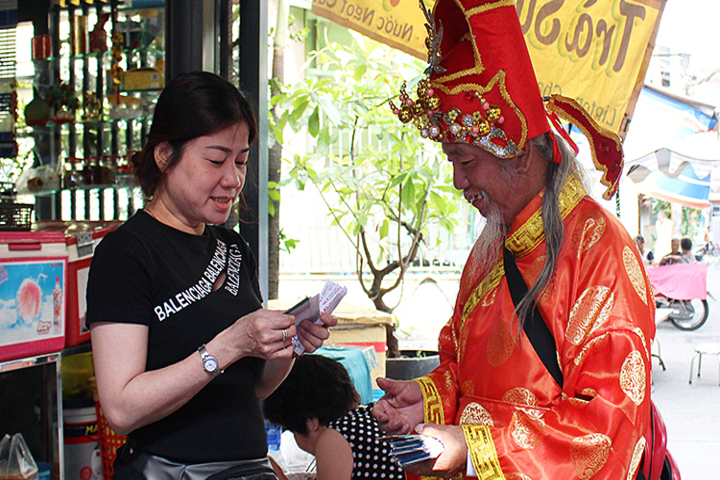 Vào những ngày mùng 10 âm lịch – ngày Thần tài theo quan niệm của người Hoa, ông mặc thêm bộ quần áo thần tài màu đỏ đến các chợ hoặc khu đông người Hoa ở quận 11 để bán. Ông giải thích, bán vé số nhưng cũng phải sạch sẽ, gọn gàng người ta mới mua, vào ngày Thần tài, những người buôn bán thường thích mua vé số để cầu may mắn.
