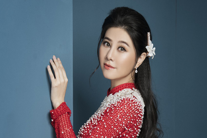 Nghệ sĩ cải lương Quế Trân diện áo dài voan phối ren hoặc đính hạt dành cho cô dâu.