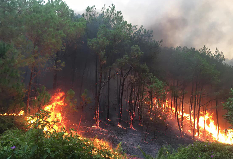 Lửa bùng lên liên tiếp ở rừng thông, lan nhanh do gió thổi mạnh tại khu vực xã Diễn An và Diễn Phú, huyện Diễn Châu, tối 29/6.