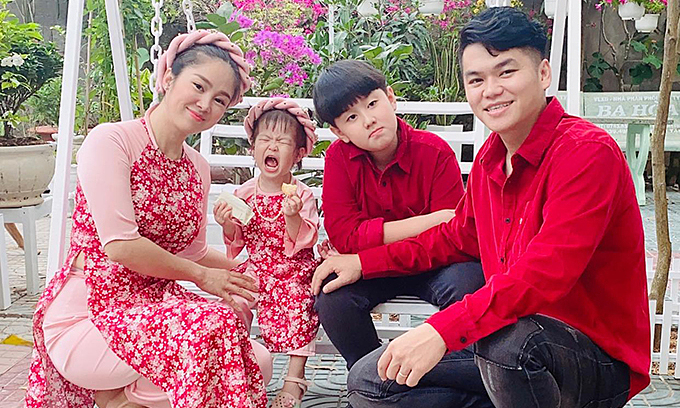 Vợ chồng nhạc sĩ Minh Khang – cựu người mẫu Thuý Hạnh quây quần bên hai cô con gái trong căn biệt thự trang trí đầy đào, mai.