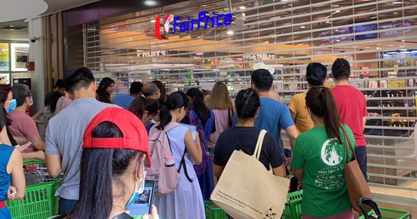 Người Singapore xếp hàng dày đặc bên ngoài siêu thị FairPrice chiều 3-4 khi cửa siêu thị đóng vì bên trong đã có quá đông người đang mua hàng – Ảnh: CHINH NGUYỆT