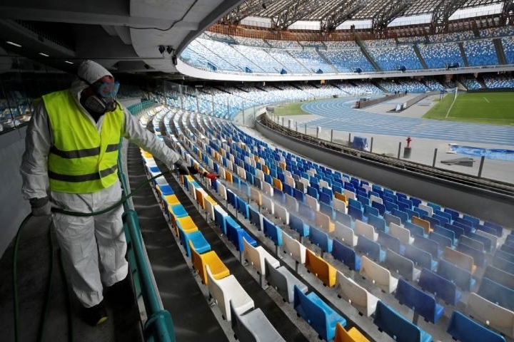 Một người khử trùng ghế trong sân vận động San Paolo ở Naples ngày 4/3. Ảnh: Reuters.