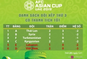 Việt Nam xếp thứ năm ở nhóm tranh vé vớt sau hai lượt trận Asian Cup