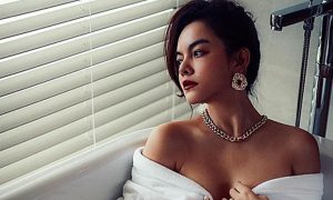 Ca sĩ Phạm Quỳnh Anh ngồi trong bồn tắm, khoác áo choàng hờ hững để