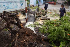 Đi dưới sân trường lúc mưa gió, ba nữ sinh lớp 8 trường THCS Trần