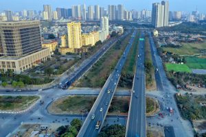 Sau khi xén thảm cỏ dải phân cách giữa, mỗi bên đường gom đại lộ