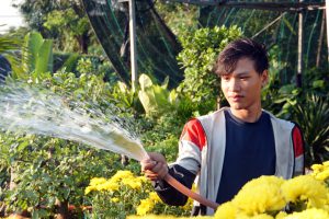 Bê chậu cảnh lên xe cho khách, Trần Xuân Đức (22 tuổi) lại đi bật