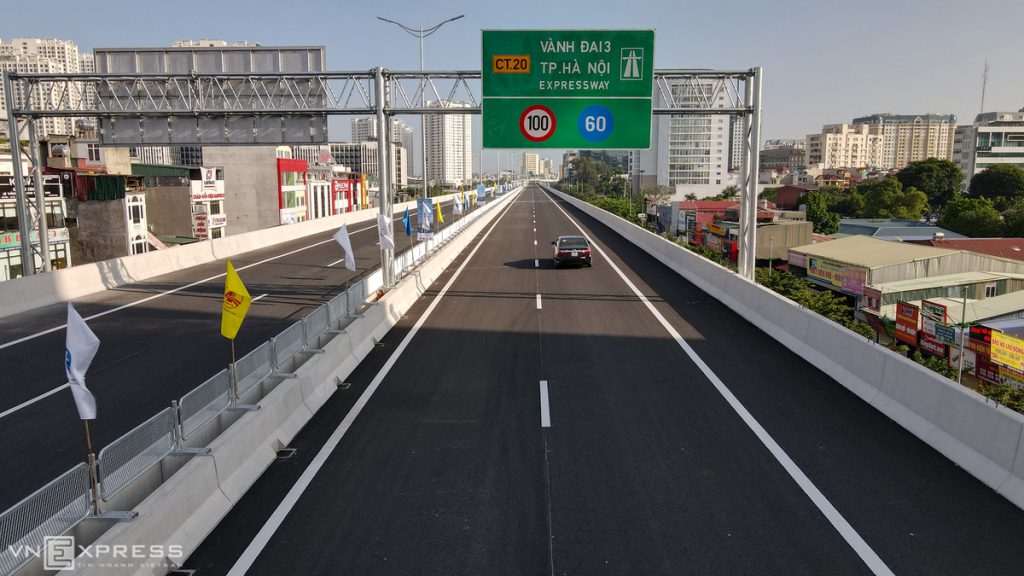 Bên dưới cầu là đường Phạm Văn Đồng được mở rộng mỗi bên 6 làn xe, với cảnh quan xanh cho cửa ngõ thủ đô. Đường này đã được thông xe hơn một năm trước.