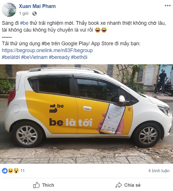 Trong sáng nay, một startup gọi xe Việt mang tên Be của anh Jimmy H. Tran cũng chính thức launching, đã dùng thử thấy UI/UX ngon quá, lại còn khuyến mại tưng bừng, xe thì nhiều. Không hiểu sao mình có linh cảm Be sẽ là chú ong chích cho 2 ông Grab và Go-Viet (Go-Jek) những đòn đau trong thời gian tới. Mình sẽ ủng hộ các doanh nghiệp Việt như vậy. Status của anh Nguyễn Văn Tuấn phó tổng giám đốc Vccorp.