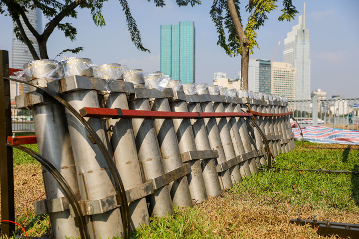 Những thùng pháo hoa tầm thấp bài trí men theo bờ sông Sài Gòn.