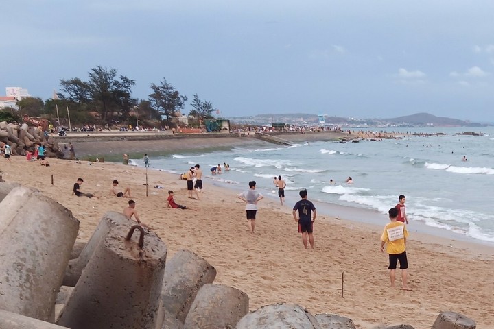 16h30, một số nhóm thanh niên địa phương mang bóng ra chơi trên bãi cát. Sau đó chừng nửa giờ, bãi biển đông thêm bất thường so với những ngày trước đó. Không những người lớn mà cả trẻ em cũng theo cha mẹ ra đây. “Hôm nay cuối tuần, trời nóng nực quá, cả nhà chở nhau ra tắm cho mát”, anh Xuân nói.