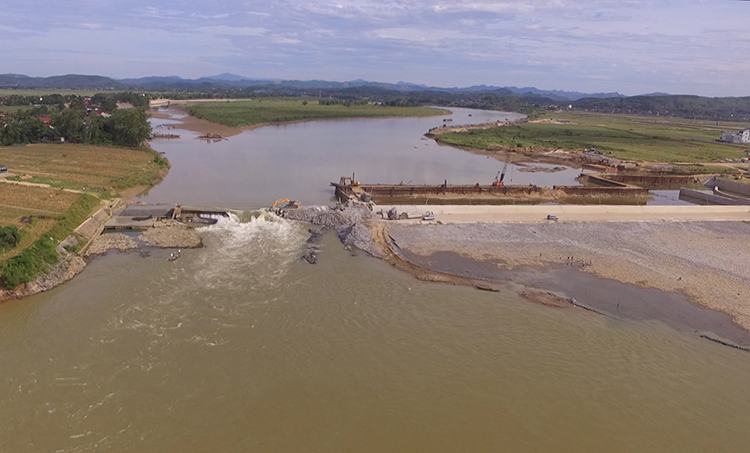 Sau khi “vá”, đơn vị thi công sẽ đóng cọc cừ phía trên để thi công đoạn này. Vật liệu dùng ngăn dòng sẽ được múc đi. Nước từ thượng lưu đổ về sẽ được điều tiết qua hai cửa xả cát hoặc đoạn tràn tự do đã thi công xong.