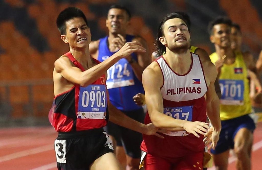 Dương Văn Thái bị chân chạy Philippines huých mất thăng bằng gần vạch đích vẫn về nhất ở cự ly 800 mét.