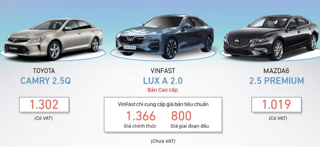 Mời độc giả cùng dạo qua một số chỉ tiêu về giá & kỹ thuật khi làm phép so sánh về mẫu Sedan của Vinfast, Lux A2.0 và Camry 2.5Q cùng Mazda6.