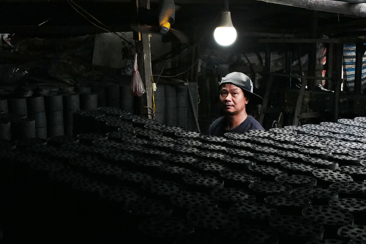 Ông Biển, chủ một lò than đứng lọt thỏm trong căn nhà xung quanh là hàng nghìn viên than ế ẩm. “Nhà chỉ có hai vợ chồng làm nghề này nhưng đầu ra ngày càng chậm nên chúng tôi chưa biết tính sao”, ông nói.