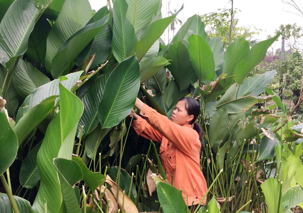 Những ngày này, người dân thôn Vĩnh Phúc tất bật ra vườn cắt lá dong nhập cho thương lái hoặc đưa ra chợ huyện bán. Toàn thôn có khoảng 100 hộ dân trồng cây dong, mỗi hộ trồng 300-3.000 m2.