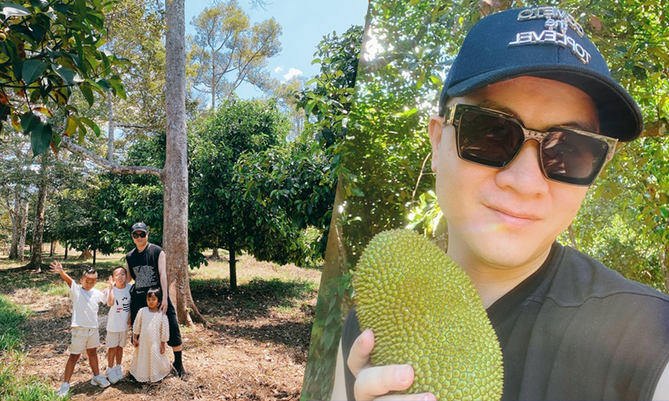 Cuối tuần, NTK Đỗ Mạnh Cường chạy xe từ TP HCM lên Lâm Đồng đưa các con tới thăm vườn cây của gia đình. Anh mua mảnh đất rộng 14.000 m2 từ năm ngoái, khi tại đây đã trồng sẵn một số cây ăn quả như mãng cầu, sầu riêng, chôm chôm và mít. NTK dự định sắp tới biến nơi này thành khu nghỉ dưỡng cho các con.