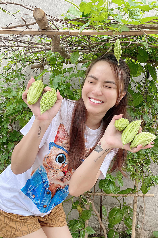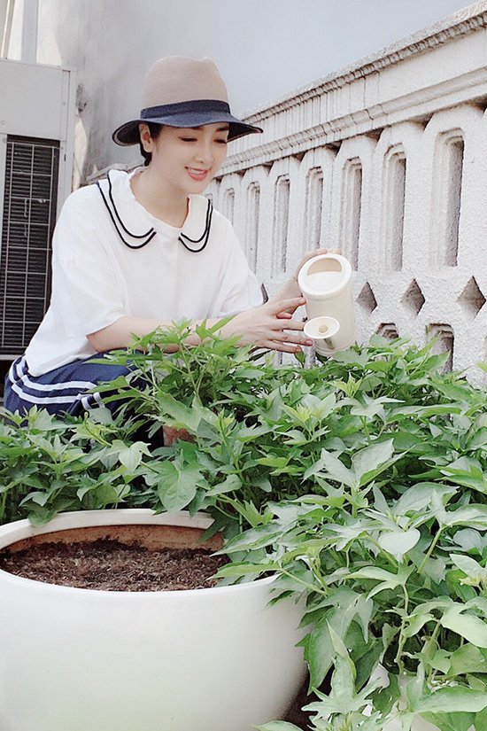Hoa hậu Đền Hùng Giáng My tận dụng nhiều không gian trong biệt thự của chị để trồng rau lang, muống, bầu, bí, khổ qua… Thú vui của chị mỗi ngày là ngắm thành quả trồng trọt, thăm từng nhánh rau, cành hoa. Chị cũng thường xuyên nghĩ ra các công thức chế biến món ăn từ nguyên liệu vườn nhà.