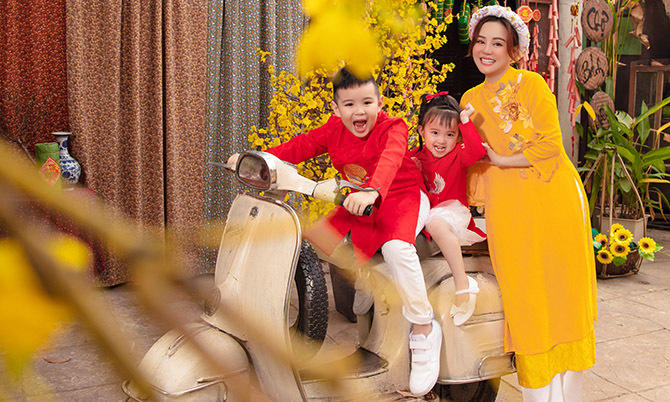 Ca sĩ Vy Oanh cùng hai bé Voi và Xu diện áo dài truyền thống tạo dáng chụp ảnh trong không gian đậm màu sắc Tết cổ truyền.