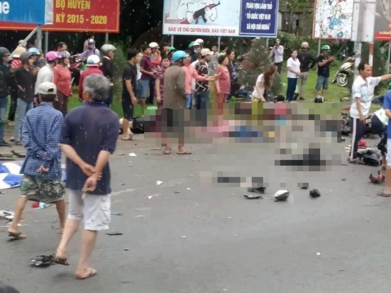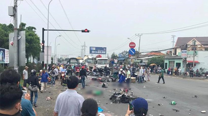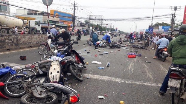 Được biết, sau khi gây tai nạn liên hoàn, xe container kéo nhiều xe máy chạy hơn 50 mét nữa mới dừng lại.