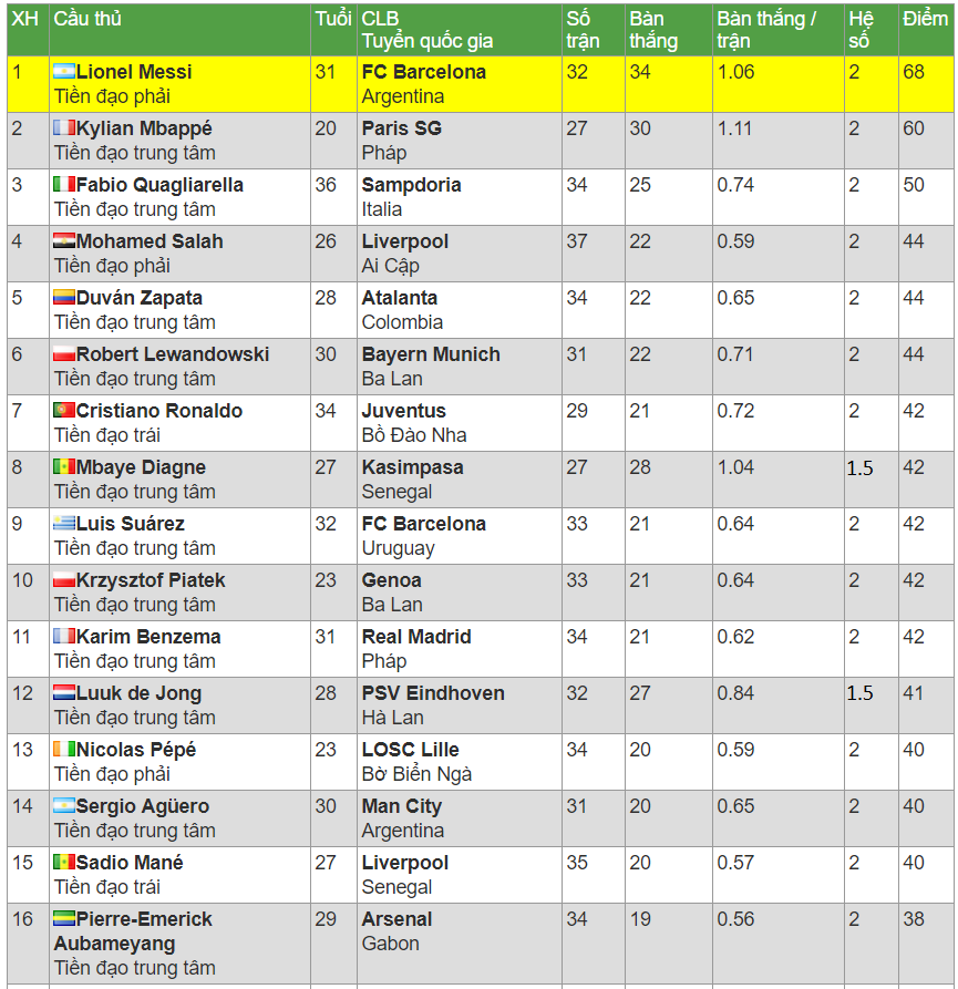 Cập nhật danh sách cuộc đua Chiếc giày vàng châu Âu mùa giải 2018/2019